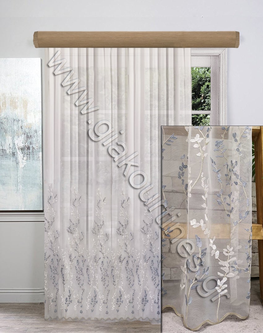 Κουρτίνα πολυτελείας, με διαφάνεια, έτοιμη ραμμένη. Ύφασμα τούλινη φλάμα ατσαλάκωτη, Ευρωπαίκών προτύπων και ποιότητας. Διαθέτει φιστόνι στο τελείωμα και μοντέρνο κέντημα κλαδί αμυγδαλιάς χρώμα σαμπανιζέ, παστέλ μπλε ραφ και κλαδί μπεζ, που φτάνει σε ύψος 1,20μ.