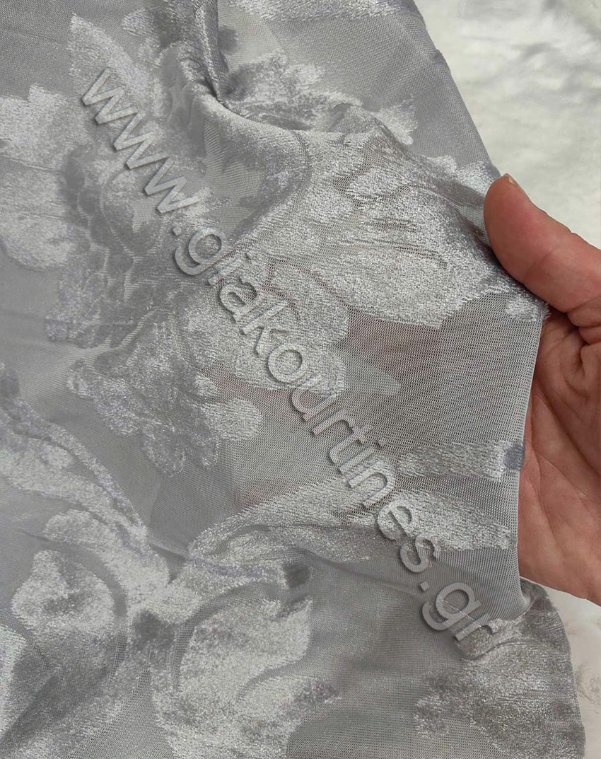 Κουρτίνα διάφανη, εξαιρετικά χυτή και μαλακή αίσθηση. Το χρώμα της κουρτίνας είναι ανοιχτό γκρι με βελουτέ μπαρόκ μοτίβα. Ιδανικό και για ριντό πάνω από άλλη κουρτίνα.