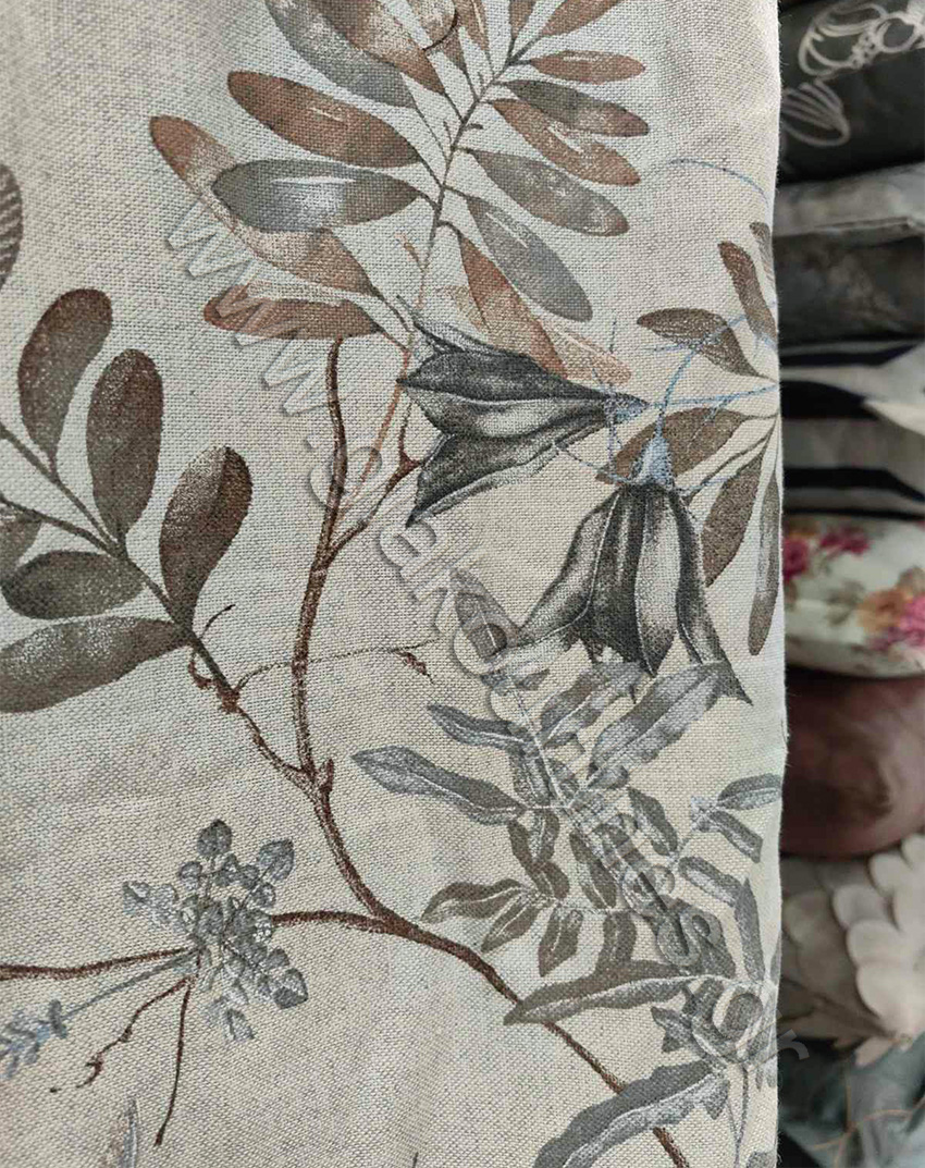 Κουρτίνα αδιάφανη έτοιμη ραμμένη. Λονέτα Ισπανίας, μπεζ προς σπαγκί με μοτίβο σιέλ και καφέ.