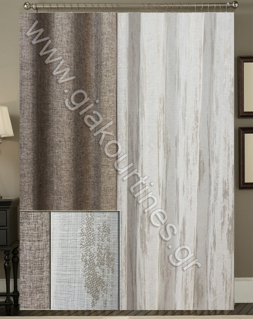 Κουρτίνα τύπου λινό πολυέστερ ημιδιάφανη. Μοντέρνο ύφασμα ατσαλάκωτο με ματ υφή, με σχέδιο φιλ κουπέ βροχή. Το χρώμα της κουρτίνας είναι υπόλευκο με γκρι.