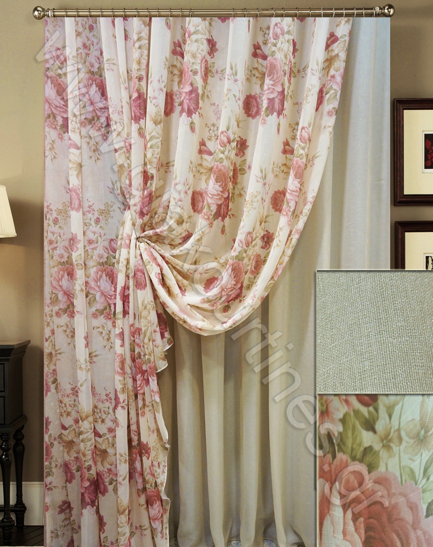Ριντό, φλοράλ τύπου λινό πολυέστερ ημιδιάφανο. Είναι ατσαλάκωτο και χυτό ύφασμα με βαρίδιο στο τελείωμα. Το χρώμα της κουρτίνας είναι μπεζοεκρού με λουλούδια ροζ, σομόν, απαλό μπορντό. Η κουρτίνα αυτή δεν χρειάζεται σίδερο.