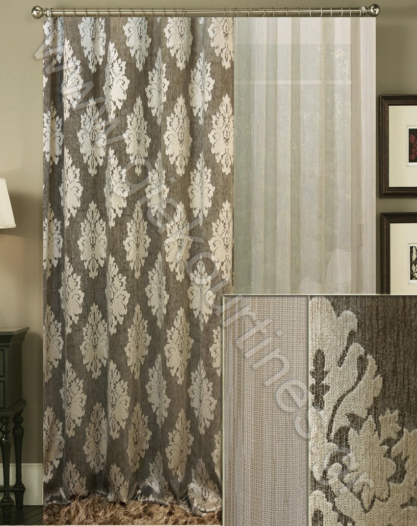 Ριντό αδιάφανο ραμμένο. Είναι ανάγλυφο μπαρόκ ύφασμα. Το χρώμα της κουρτίνας είναι γκριζοέλεφαντ με μπαρόκ βελουτέ χρώμα μπεζ του πάγου.