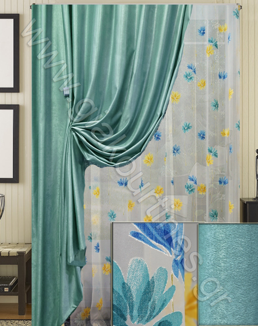 Ριντό πυκνό, αδιάφανο κουρτίνα , βελούρ. Είναι χυτό και μαλακό ύφασμα. Το χρώμα του είναι απαλό τυρκουάζ.