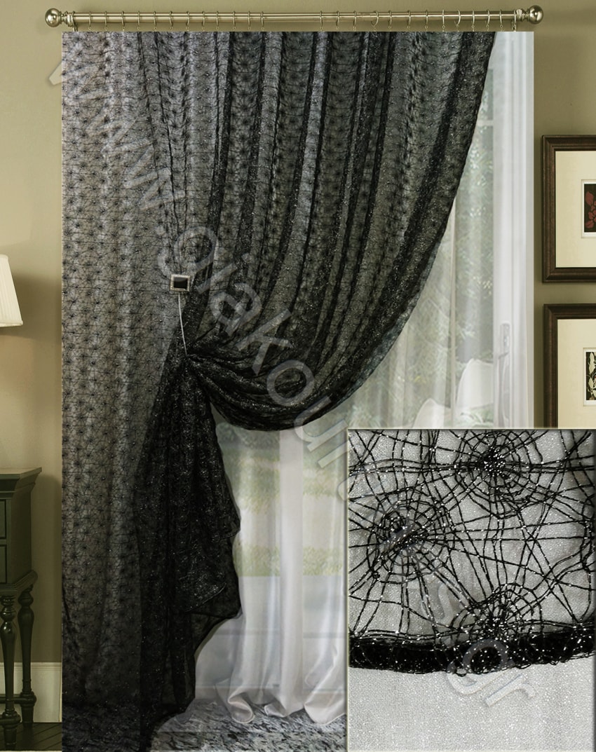 Κουρτίνα ραμμένη διάφανη, δίχτυ αράχνη διάτρητο. Μοντέρνο ύφασμα, χυτό και μαλακό, δεν χρειαζεται σίδερο. Το χρώμα της κουρτίνας είναι μαύρο με ασημί λάμψεις.
