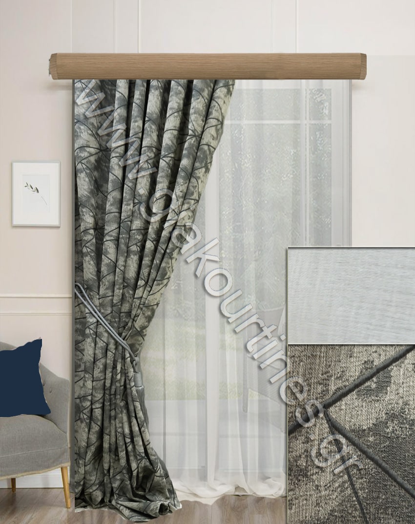 Ριντό ζακάρ εξαιρετικά χυτό, ύφασμα Ευρωπαϊκών προδιαγραφών. Μοντέρνο ύφασμα, χρώματος απαλό γκρι με μοντέρνο μπλε μοτίβο. Εσωτερική κουρτίνα διάφανη, με βαρίδι στο τελείωμα, ποιότητα ματ κρυσταλλική ζορζέτα, χρώμα λευκό