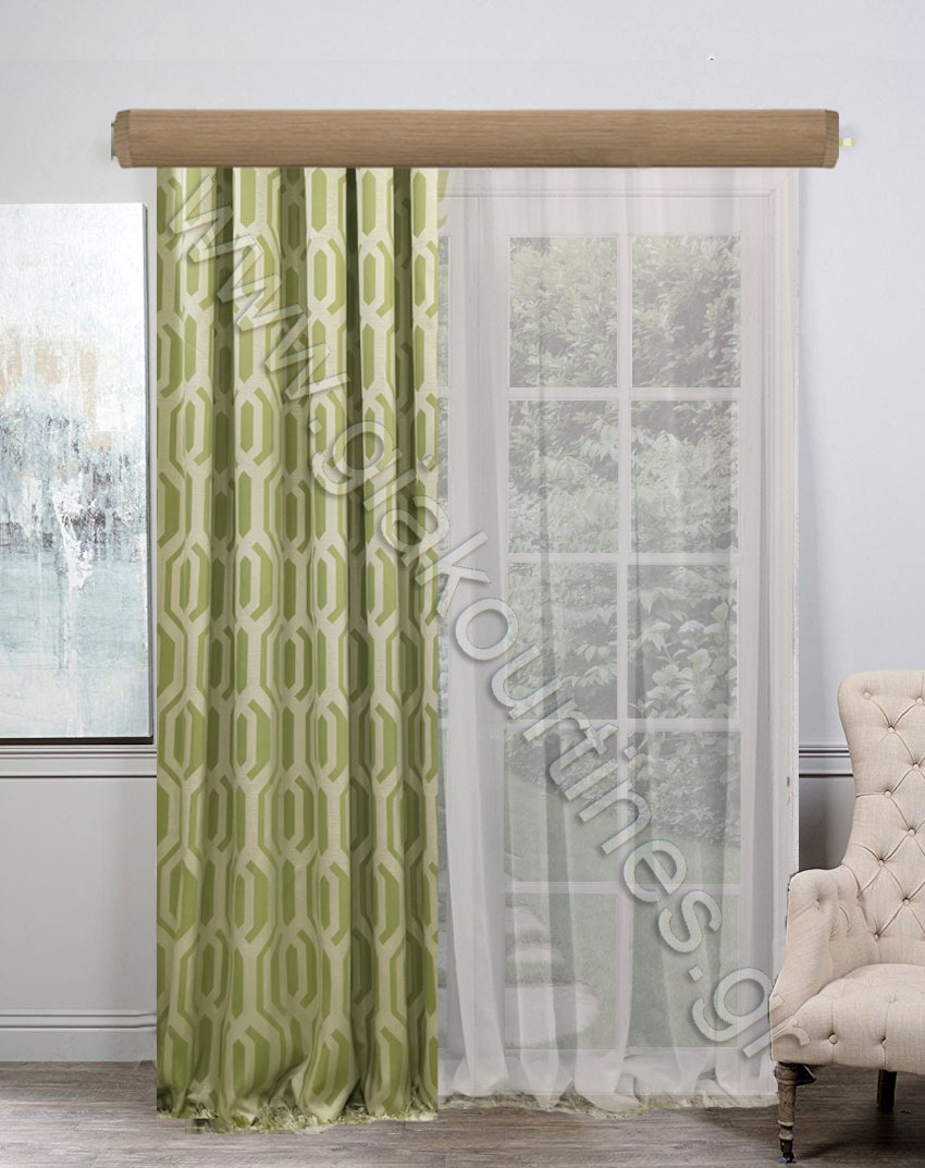 Κουρτίνα σκίασης έτοιμη ραμμένη. Ύφασμα ματ, χωρίς διαφάνεια, Ευρωπαίκών προτύπων και ποιότητας. Χρώμα παλ lime με μοντέρνο γεωμετρικό σχέδιο χρώμα ουδέτερο smokey άμμου.