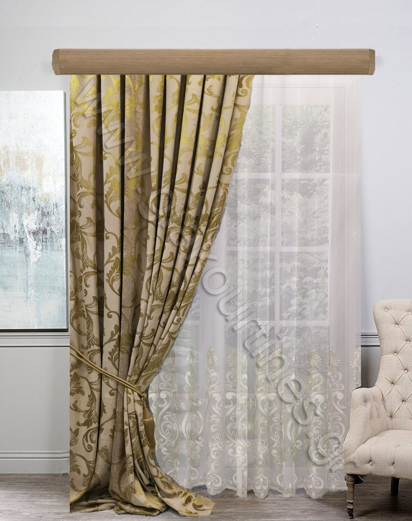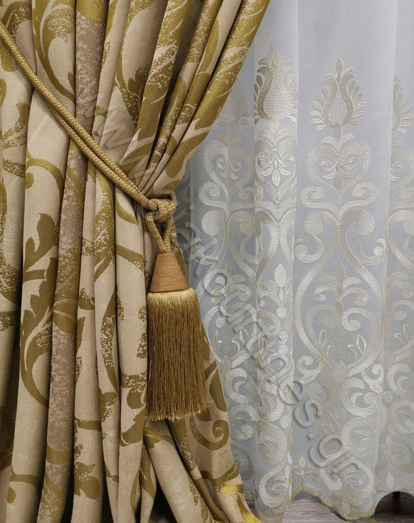 Κουρτίνα σκίασης έτοιμη ραμμένη. Ζακάρ ύφασμα πολυτελείας, εξαιρετικά χυτό και μαλακό, χωρίς διαφάνεια, Ευρωπαίκών προτύπων και ποιότητας. Χρώμα μπεζ με χρυσολαδί μπαρόκ μοτίβο.