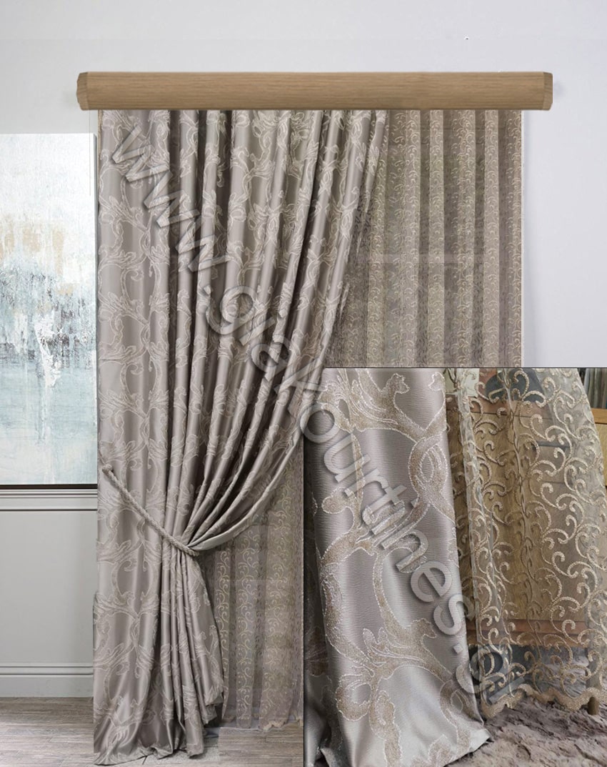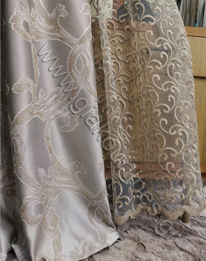 Κουρτίνα σκίασης έτοιμη ραμμένη. Ύφασμα ζακάρ πολυτελείας, χωρίς διαφάνεια, Ευρωπαίκών προτύπων και ποιότητας. Είναι χυτό ύφασμα, με μπαρόκ μοτίβο κλαδί. Το χρώμα της κουρτίνας είναι απαλό γκρι με μοτίβο απαλό παστέλ καφέ και περίγραμμα του πάγου.