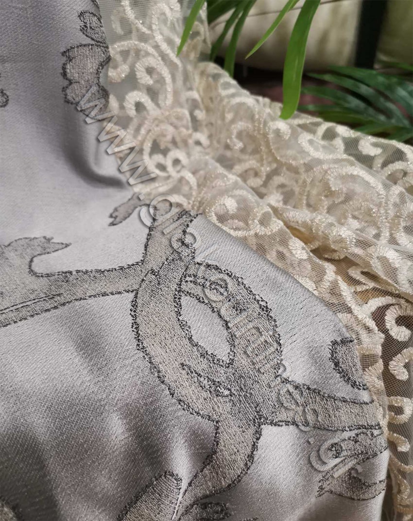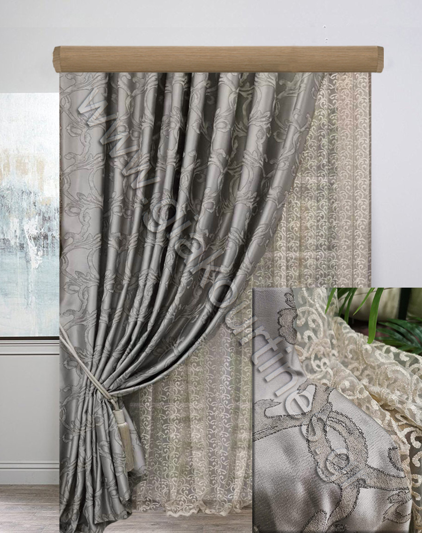 Κουρτίνα σκίασης έτοιμη ραμμένη. Ύφασμα ζακάρ πολυτελείας, χωρίς διαφάνεια, Ευρωπαίκών προτύπων και ποιότητας. Είναι χυτό ύφασμα, με μπαρόκ μοτίβο κλαδί. Το χρώμα της κουρτίνας είναι γκρι με μοτίβο χρώμα της άμμου.