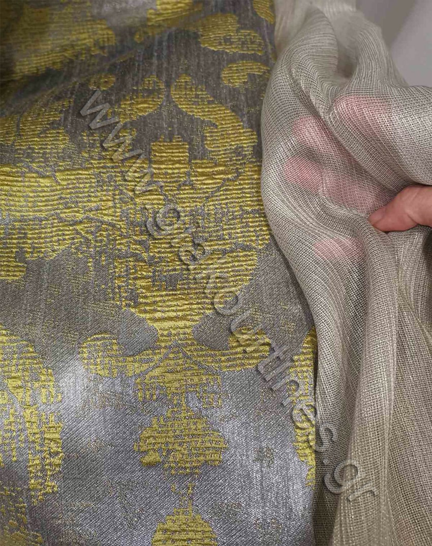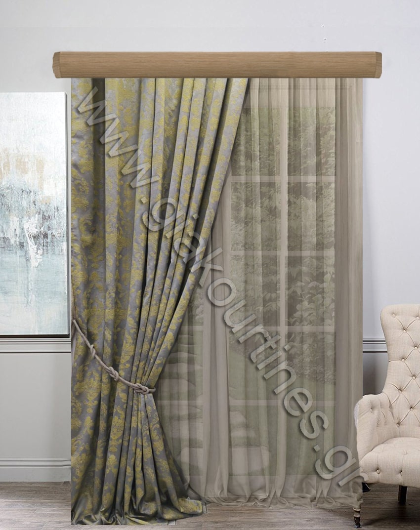 Κουρτίνα σκίασης έτοιμη ραμμένη. Ύφασμα ζακάρ πολυτελείας, χωρίς διαφάνεια, Ευρωπαίκών προτύπων και ποιότητας. Το χρώμα της κουρτίνας είναι γκρι με damasko μοτίβο χρώμα lime.