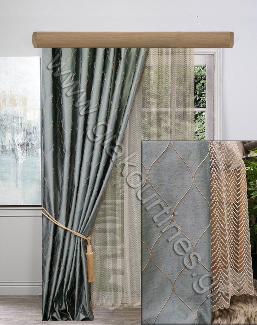 Κουρτίνα σκίασης έτοιμη ραμμένη. Ύφασμα ταφτάς ζακάρ πολυτελείας, χωρίς διαφάνεια, Ευρωπαίκών προτύπων και ποιότητας. Το χρώμα της κουρτίνας είναι πετρόλ προς πράσινο με περίγραμμα μοτίβου μπεζ και χρυσή διακριτική λεπτομέρεια στις κορυφές του μοτίβου.