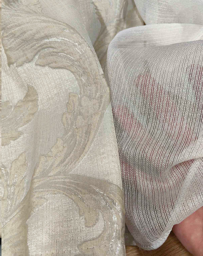 Ριντό ζακάρ, χωρίς διαφάνεια, Ευρωπαϊκών προδιαγραφών. Ύφασμα εξαιρετικής ποιότητας, χρώμα ιβουάρ με ανάγλυφο σχέδιο κλαδί. Εσωτερική κουρτίνα διάφανη, ατσαλάκωτη, με βαρίδι στο τελείωμα, το χρώμα της κουρτίνας είναι λευκό με διακριτική ρίγα στην ύφανση.. (Εάν επιθυμείτε να συνδυάσετε άλλη εσωτερική κουρτίνα, επικοινωνήστε μαζί μας)
