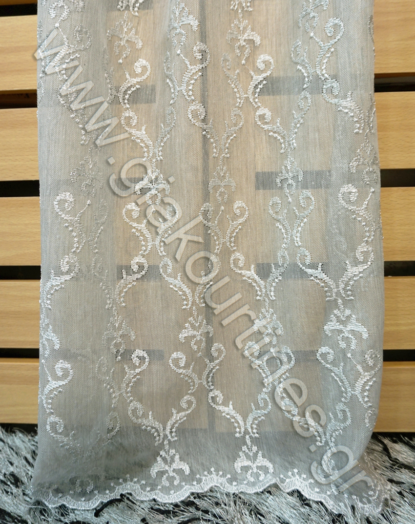 Κουρτίνα πολυτελείας φλάμα, ολοκέντητη με κλωστή glitter και φιστόνι στο τελειώμα. Είναι εξαιρετικά χυτό ύφασμα και το χρώμα της κουρτίνας είναι ανοιχτό γκρι. Δεν χρειάζεται σιδέρο, είναι ατσαλάκωτο ύφασμα.