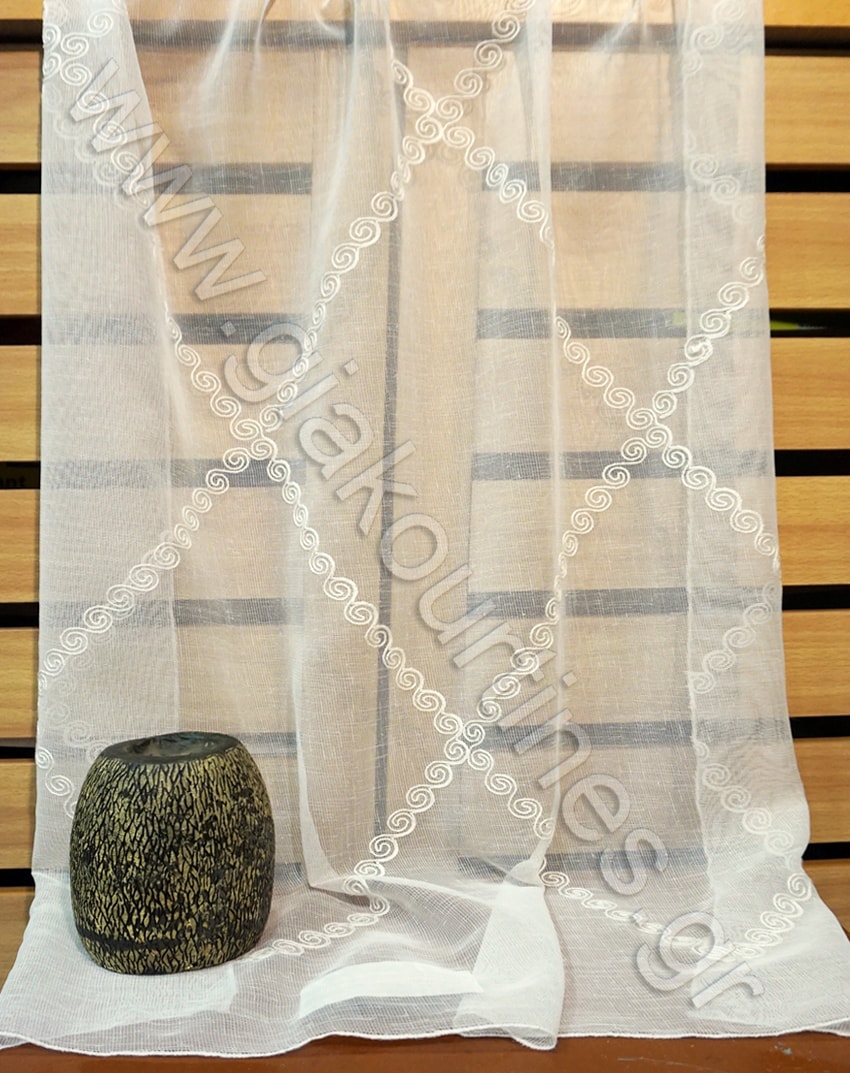 Κουρτίνα ματ, τύπου λινό, διάφανη. Είναι μοντέρνα, χυτή κουρτίνα, με βαρίδι στο τελειώμα. Το χρώμα της κουρτίνας είναι λευκό με κέντημα λευκό.