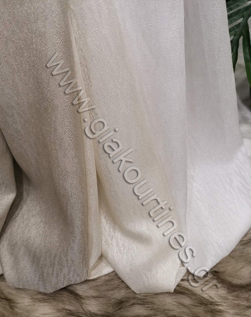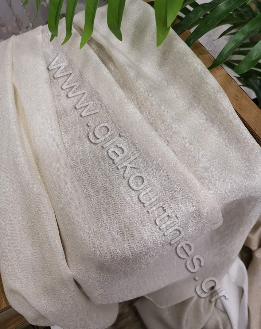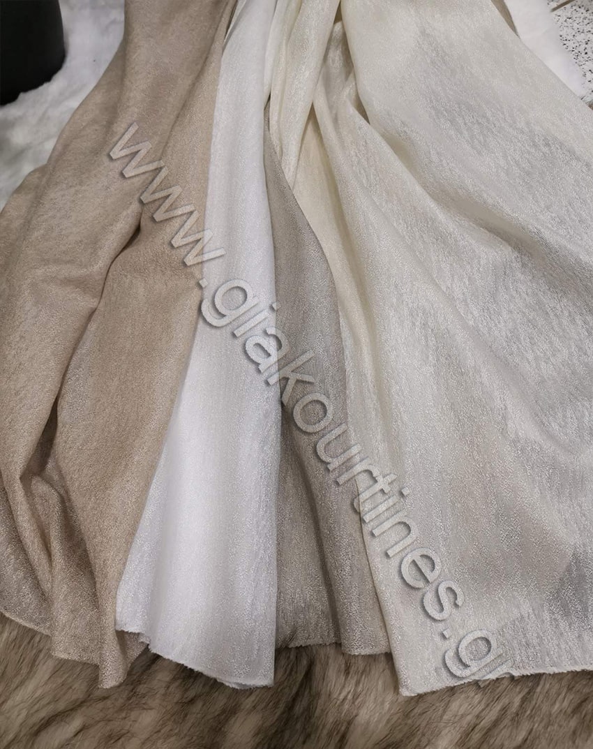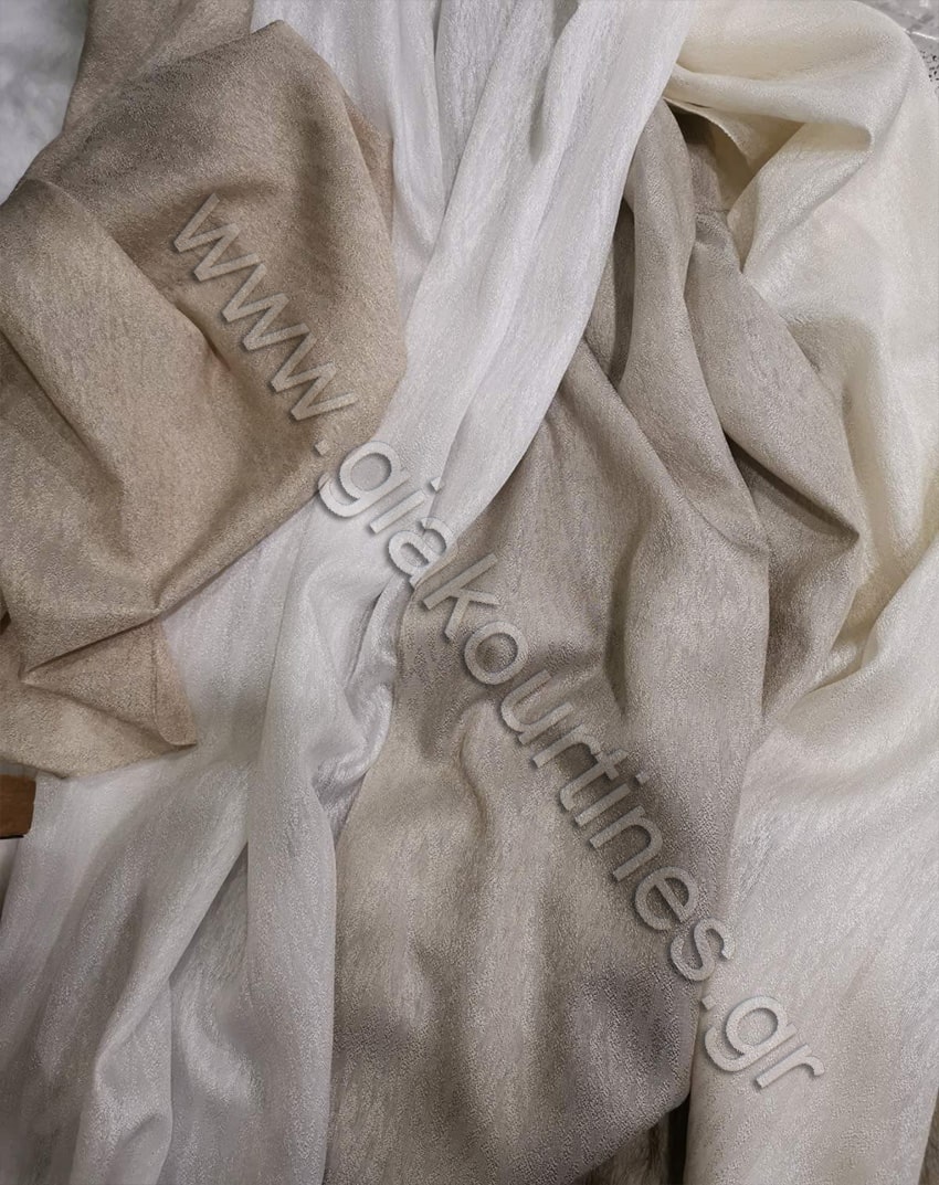 Ύφασμα για κουρτίνα , μέτριας διαφάνειας, Ευρωπαϊκών προδιαγραφών. Κουρτίνα πολυτελείας με εξαιρετικά νήματα, εξαιρετική σταθερότητα υφάσματος, χυτό, στιβαρό και ατσαλάκωτο ύφασμα με τεχνητό μετάξι. Διαθέσιμο σε 4 αποχρώσεις λευκό, μπεζ προς εκρού , μπεζοκαφέ και μπεζολαδι σκούρο. Διαθέτει βαρίδι στο τελείωμα.