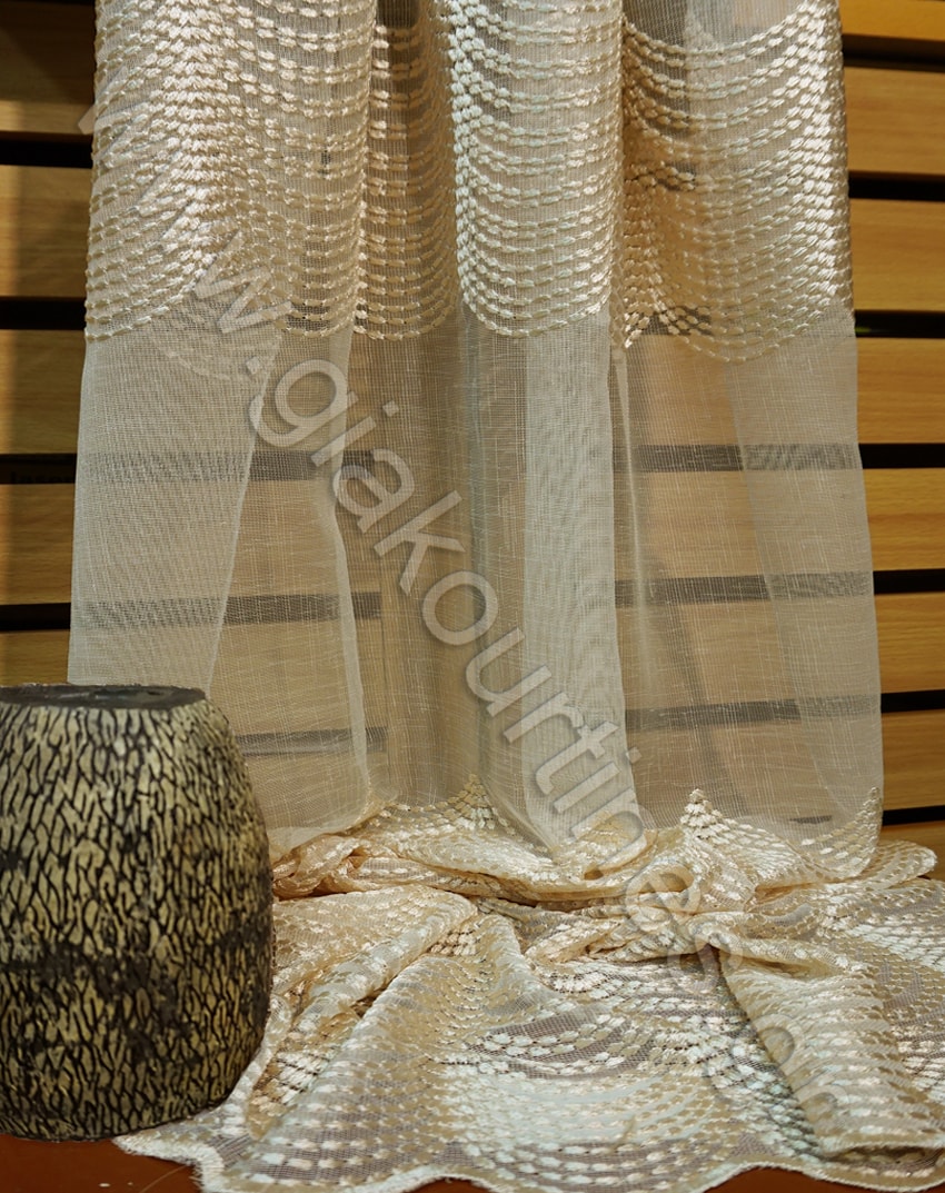 Κουρτίνα ματ, τύπου λινό, διάφανη. Είναι μοντέρνα, χυτή κουρτίνα, με φιστόνι στο τελειώμα και βαρύ κέντημα. Έχει εξαιρετικά νήματα και το χρώμα της κουρτίνας είναι ιβουάρ με κέντημα εκρού.