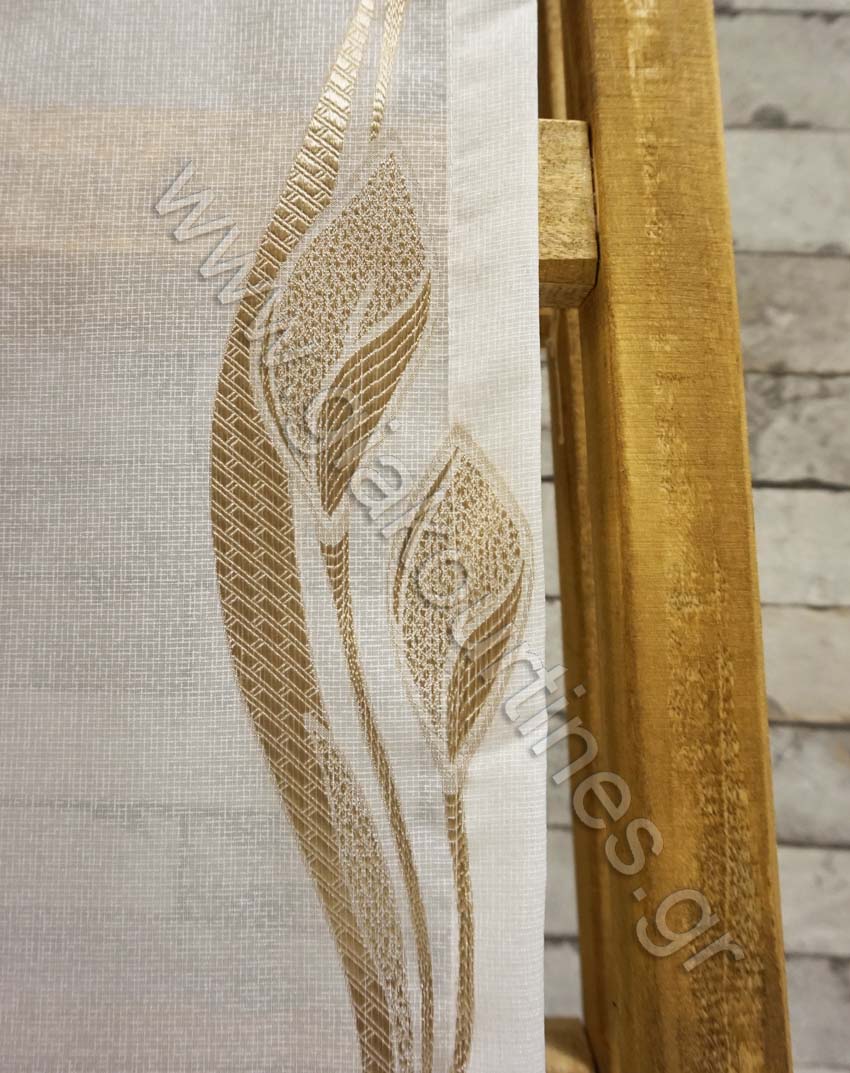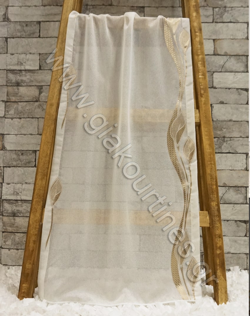 Κουρτίνα ματ, διάφανη. Είναι χυτή κουρτίνα, με βαρίδι στο τελείωμα. Έχει εξαιρετικά νήματα και το χρώμα της κουρτίνας είναι υπόλευκο με μπρονζέ σχέδιο.