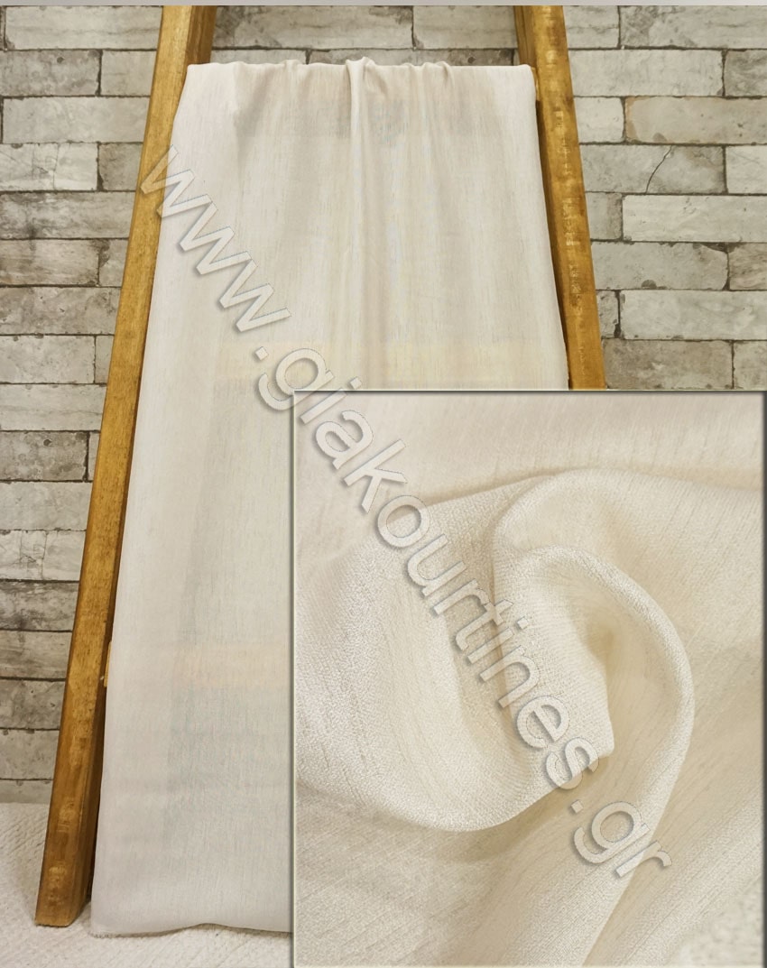 Ύφασμα για κουρτίνα με διαφάνεια, σταθερή, εξαιρετικά χυτή, Ευρωπαϊκών προδιαγραφών. Τα νήματα της είναι με τεχνητό μετάξι χρώματος μεταλλιζέ ιβουάρ . Δεν χρειάζεται σίδερο, διαθέτει βαρίδι στο τελείωμα.