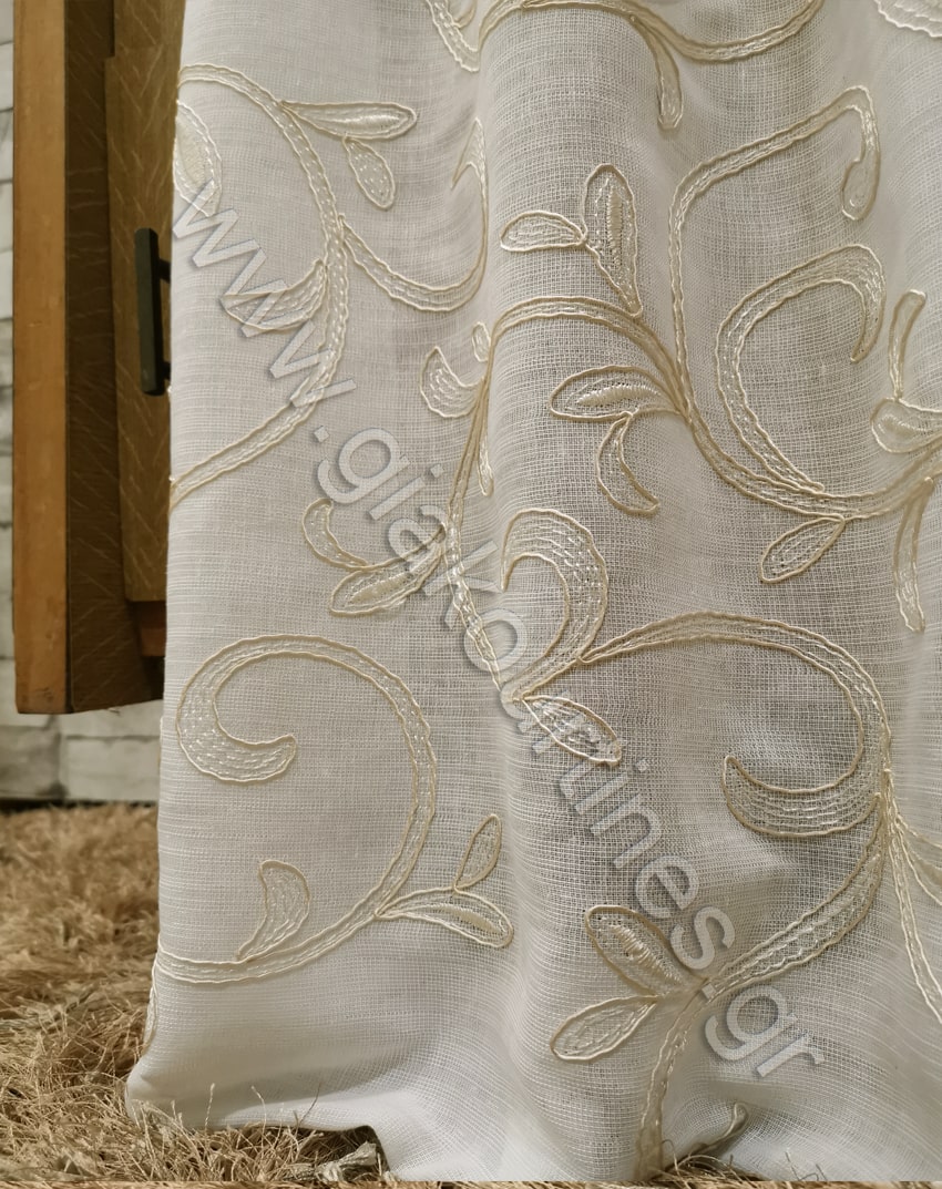 Ύφασμα πολυτελείας για κουρτίνα , μερικής διαφάνειας, Ευρωπαϊκών προδιαγραφών, με βαρίδι στο τελείωμα. Ανάγλυφο κέντημα Ά ποιότητας. Το χρώμα της κουρτίνας είναι λευκό με κέντημα ιβουάρ προς εκρού.